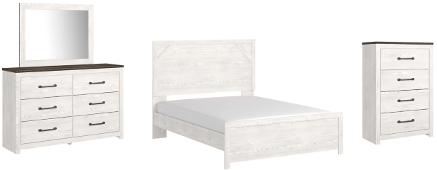 Includes queen panel bed (headboard, footboard and rails), 6-drawer dresser with mirror, and 4-drawer chest